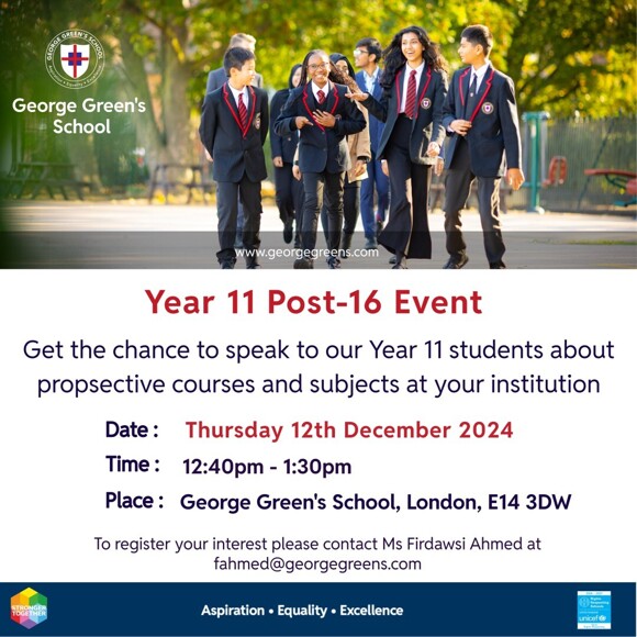 Every year, we invite in a range of colleges, sixth forms and apprenticeship providers into George Green's School to speak to our students in Year 11. This provides our students with the opportunity to find out all options, both academic and vocational in order to make an informed choice about their future.